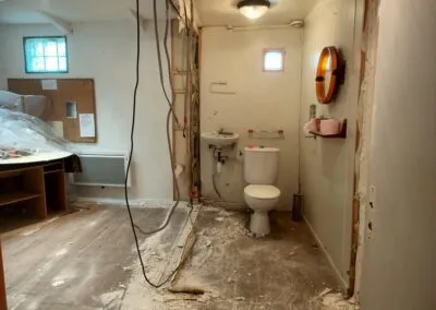 Afin de rendre notre bâtiment conforme à la norme PMR et à la sécurité, il nous faut créer une porte sans marche , une porte sortie de secours et un WC PMR. Cela nous conduit à: